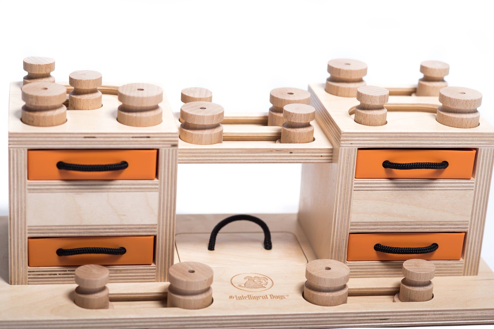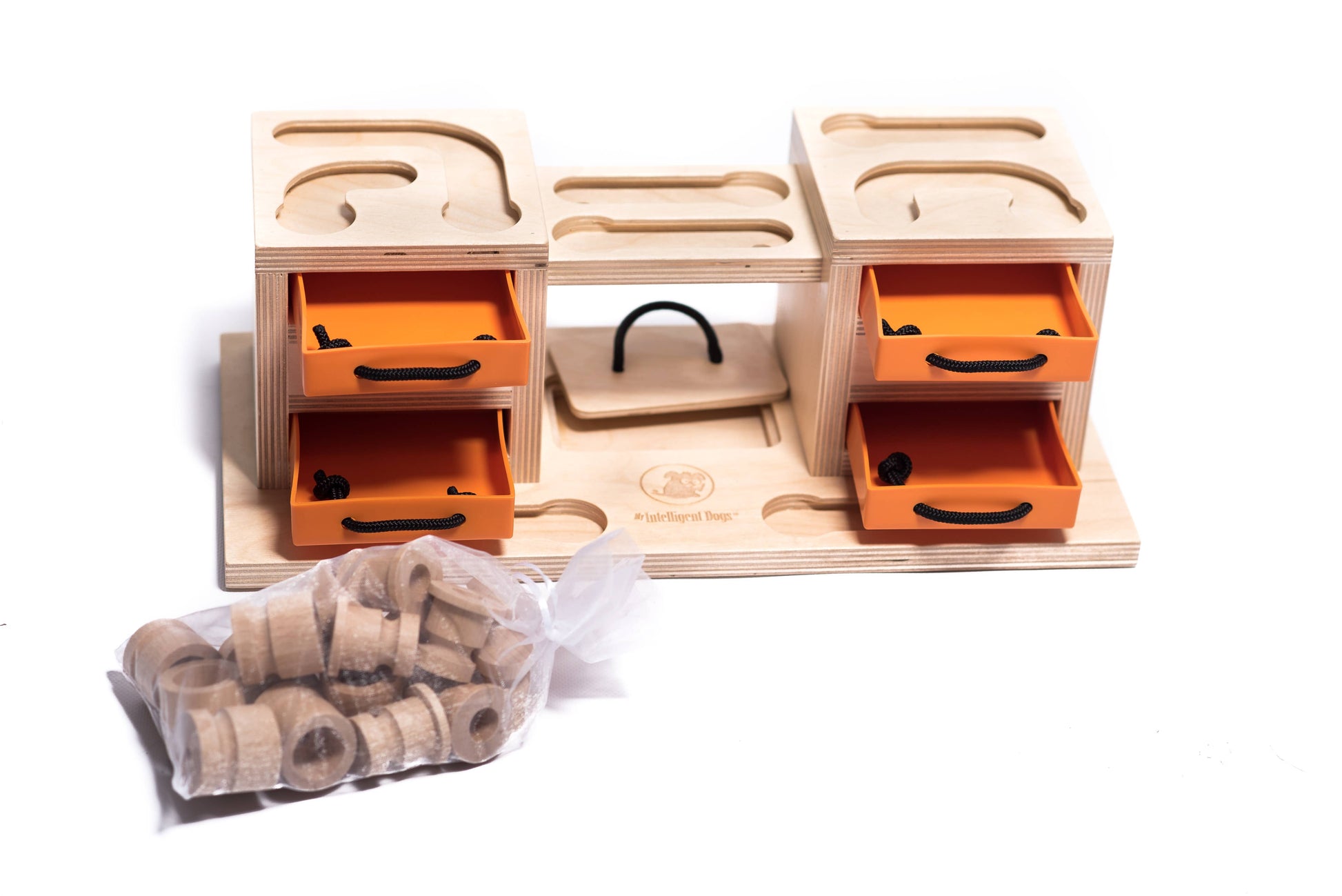 The Two Towers Dog Puzzle is a challenging intelligent game with adjustable difficulty from 1 to 4 paws. Featuring 6 drawers and 16 tokens, it can expand to 31 tasks with additional hats. This bestselling puzzle provides endless fun for dogs and owners.